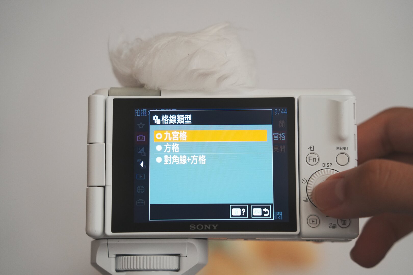 格線位置在 Menu → 拍攝設定 2 → 格線 → 選擇要使用的設定,一般人大多是用九宮格。